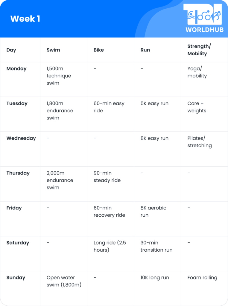 A well-balanced Half Ironman training program includes structured swim, bike, and run workouts, along with strength training, mobility exercises, and rest.